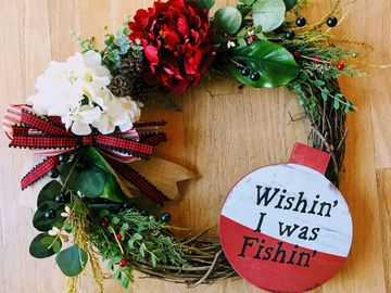 Customized for a lake house! Wreath includes eucalyptus, magnolia leaves, seaweed fern, maiden hair fern, ivy, berries, and boxwood. Black bead picks and the "Wishin' I Was Fishin'" wooden bobber are the cutest accents! Size is about 22-24".