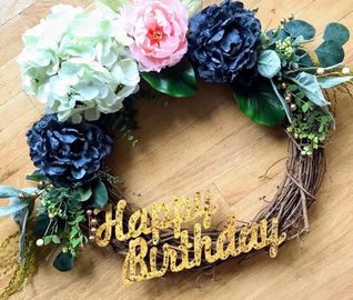 Customized birthday wreath that will be hung each month there is a birthday in the family! A beautiful white hydrangea with hints of green, two navy blue hydrangeas, and a pink peony are the focal point. Eucalyptus with lamb's ear, magnolia leaves, seaweed fern, boxwood bush and berries as well as other greenery are included. Gold and white beads as an accent. Wooden "Happy Birthday" sign painted gold with glitter.